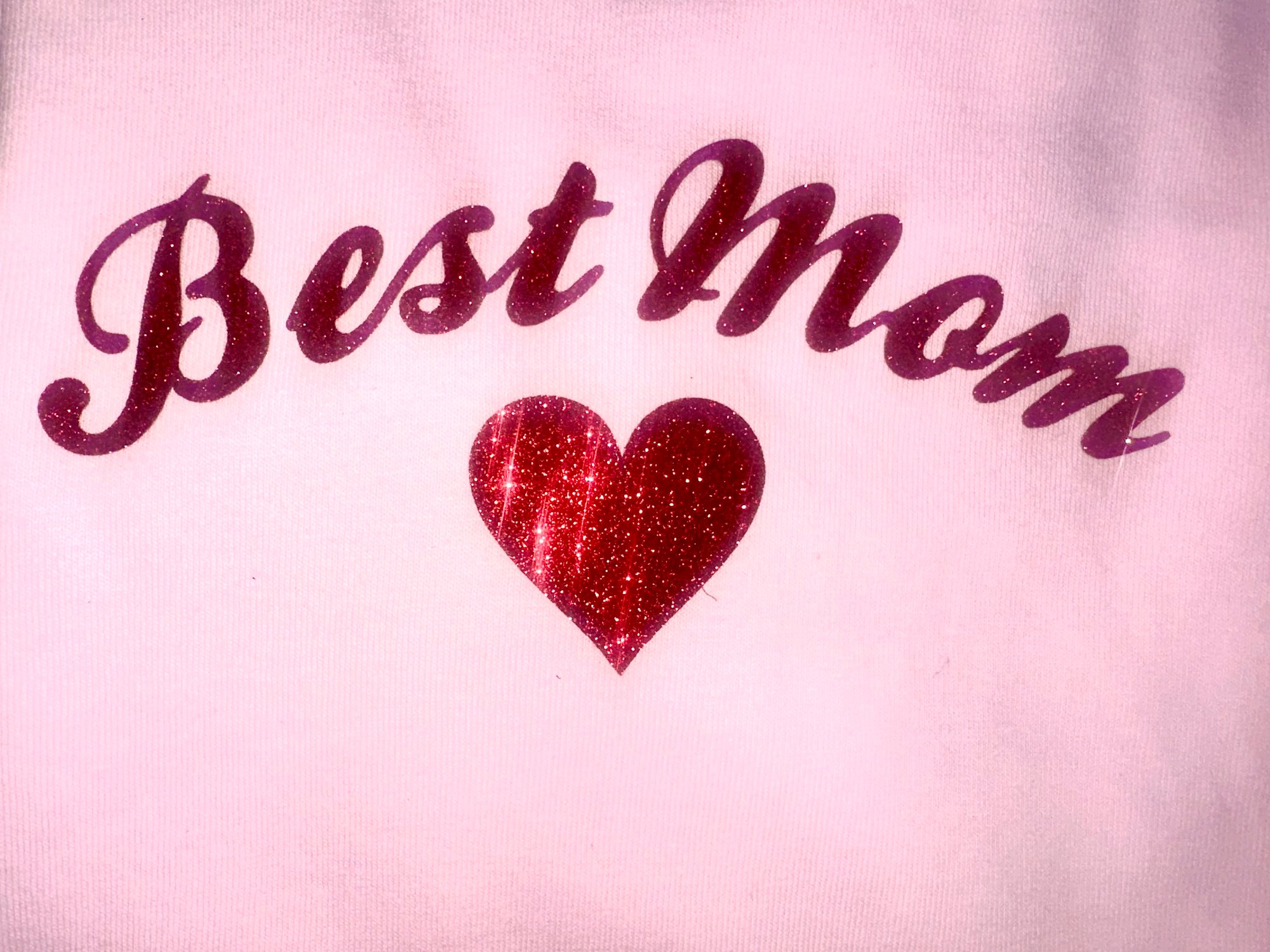baby pink tee with red glitter script spelling Best Mom with heart motif