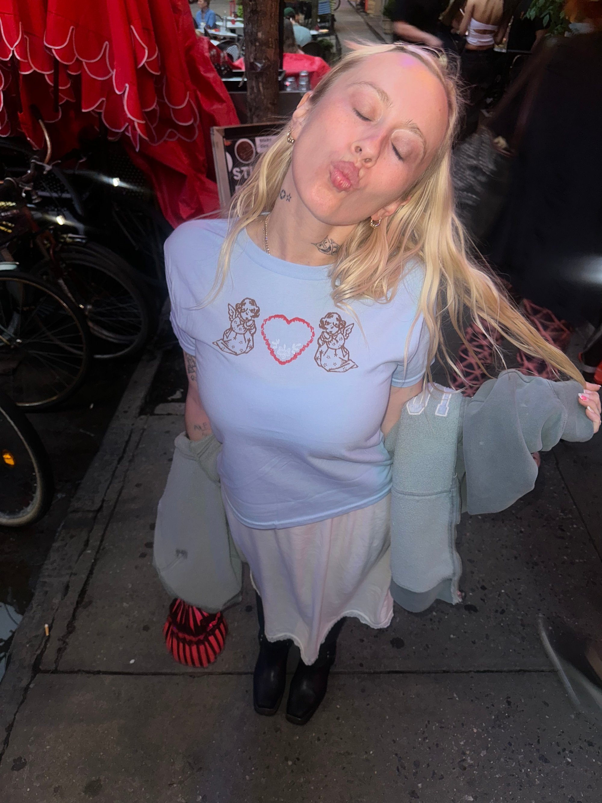 Screen print two cherub motif with embroidery style heart motif printed on Baby Blue Baby tee made by the same team who screen printed the Euphoria tees 🩷🩵